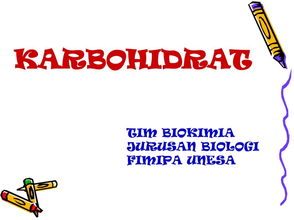 Slide ini berfungsi sebagai slide judul untuk topik "Karbohidrat" dalam mata kuliah Biokimia yang disusun oleh Tim Biokimia dari Jurusan Biologi, FMIPA, Universitas Negeri Surabaya (UNESA).