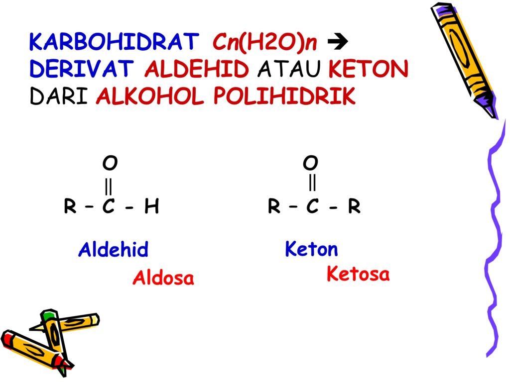 Karbohidrat pada dasarnya merupakan derivat (turunan) dari aldehid atau keton yang berasal dari alkohol polihidrik (senyawa yang memiliki lebih dari satu gugus hidroksil -OH). Berikut adalah penjelasan tentang aldehid dan keton dalam konteks karbohidrat: