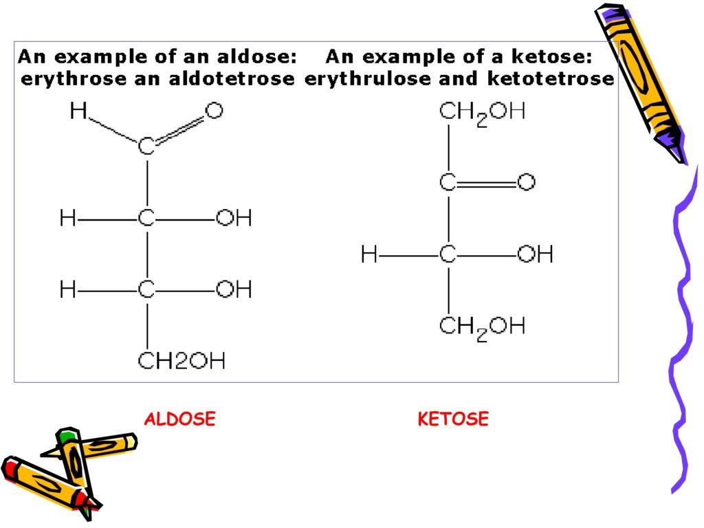 Pada bagian kanan slide ditunjukkan struktur kimia dari erythrulose, yang merupakan contoh dari ketosa dengan 4 atom karbon (tetrose).