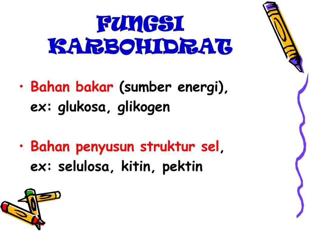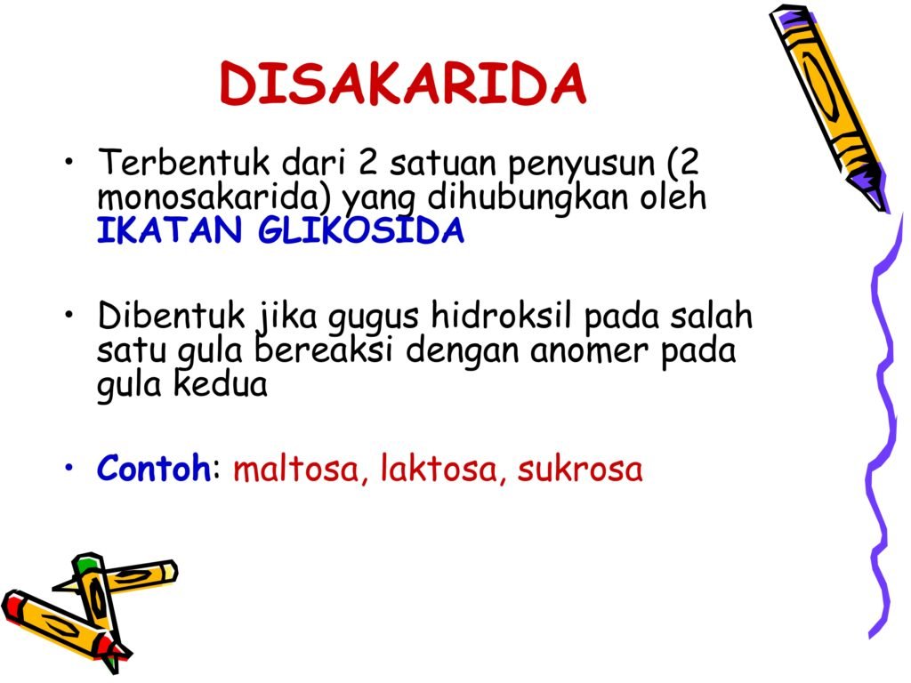 Disakarida – merupakan kombinasi dua monosakarida, seperti sukrosa (glukosa + fruktosa) dan laktosa (glukosa + galaktosa).