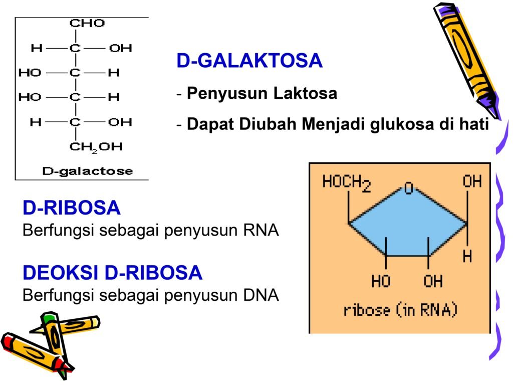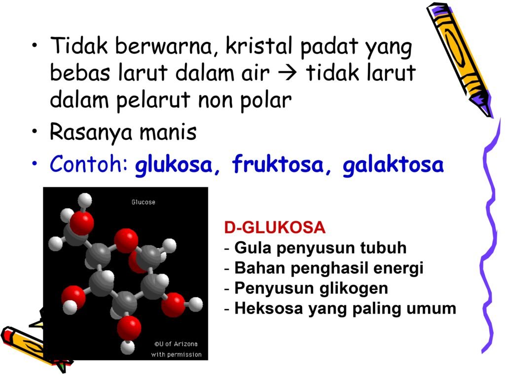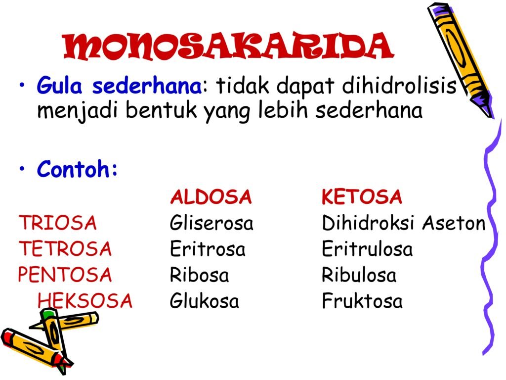 Monosakarida – merupakan unit dasar atau molekul gula tunggal seperti glukosa, fruktosa, dan galaktosa.