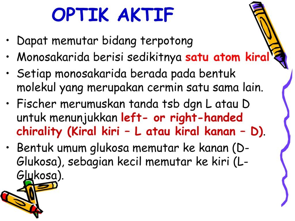 Slide ini menyajikan contoh spesifik dari dua jenis karbohidrat berdasarkan gugus fungsional yang dikandungnya, yaitu aldosa dan ketosa. Pemahaman tentang perbedaan struktural antara aldosa dan ketosa sangat penting karena keduanya memiliki jalur metabolisme dan fungsi biologis yang berbeda.