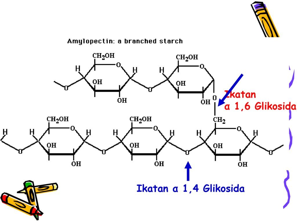 | Glikogen | Penyimpanan energi | α(1→4) dan α(1→6) | Glikogen di hati dan otot |